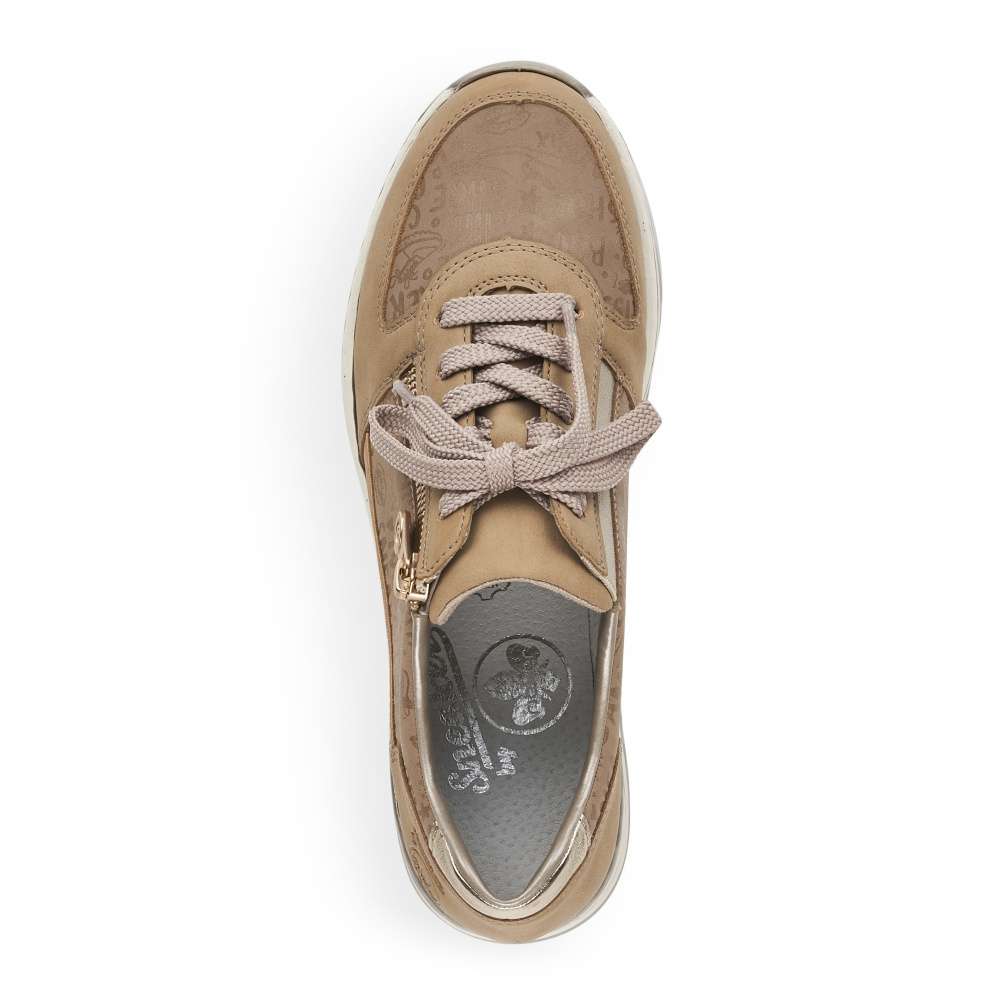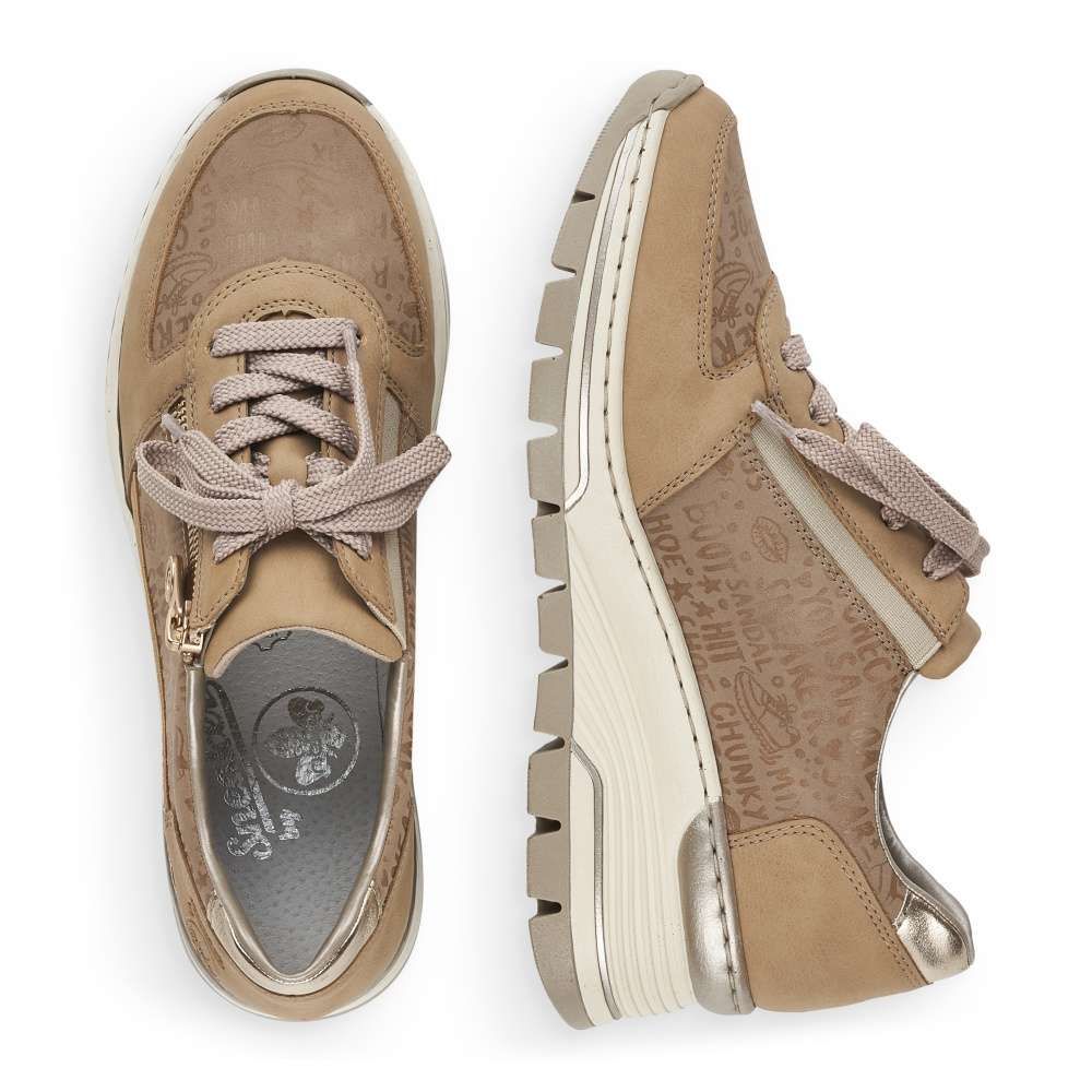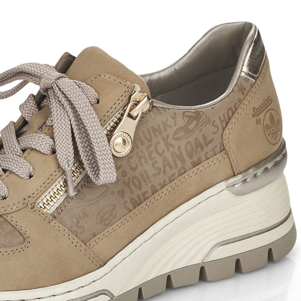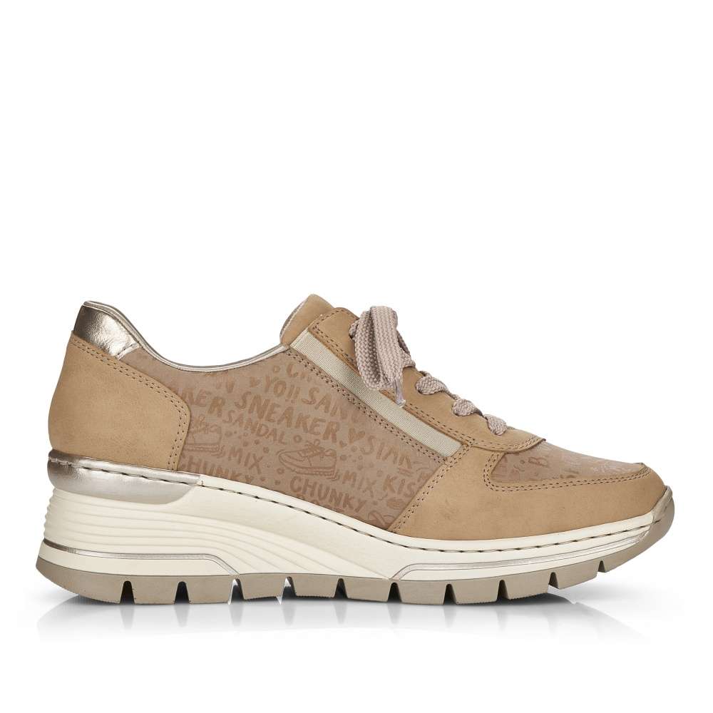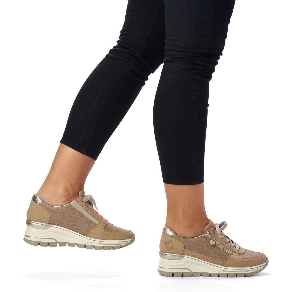 Tato krásná teniska od značky Rieker je skvělý módní doplněk, se kterým zazáříte ať už se vydáte na nákup či výlet do města. Svršek boty má velmi zajímavé provedení, ve kterém se doplňují dva odstíny béžové barvy, z nichž jeden je zdoben moderním textem. Teniska má na vnější straně funkční zip a disponuje také tkaničkami. Aby Vám skvěle padla, nachází se na vnější straně i prvek s gumičkou, díky kterému botu také pohodlně obujete. Bota navíc zaujme vyvýšenou podešví v oblasti paty, která jí dodává na originalitě. Teniska utváří skvělý outfit s riflemi i kraťasy.