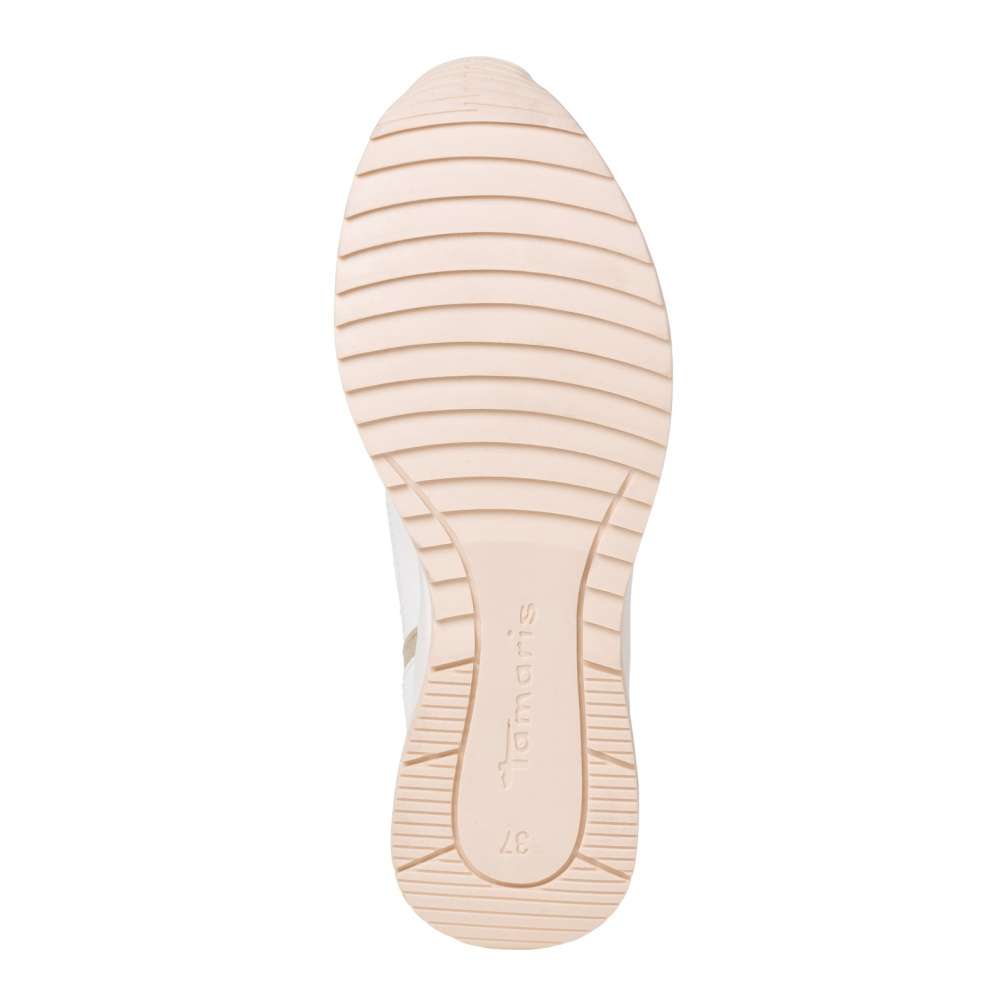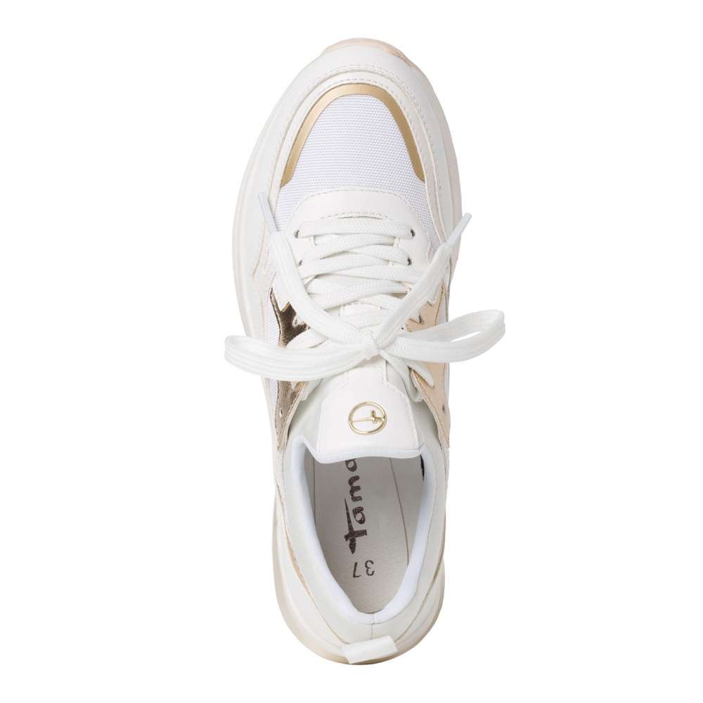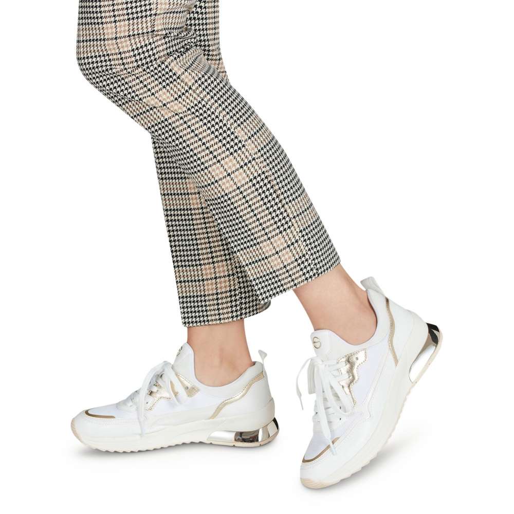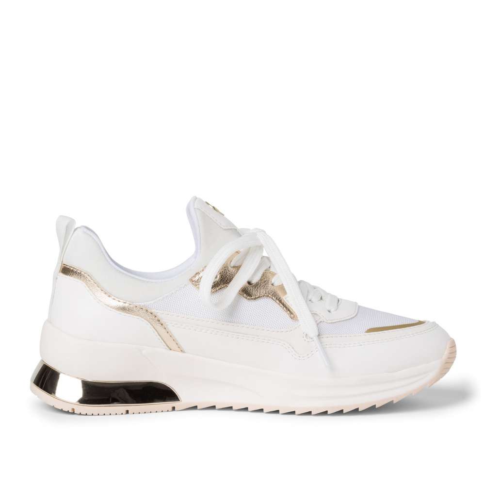 Dámské tenisky vynikají unikátní kombinací svrškových dílů v bílé barvě. Lesklé dílce zlaté barvy a designová podešev pak doladí obuv k dokonalosti. Šněrováním si boty upravíte přímo k Vaší noze. Tento velmi pohodlný a povedený model unosíte jak na procházky s dětmi, běžné pochůzky po městě, tak na cestu do práce.