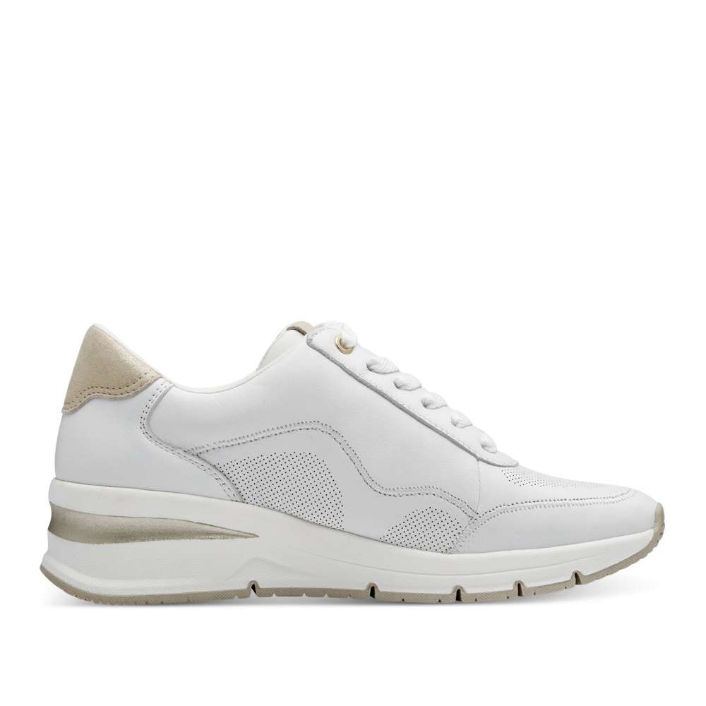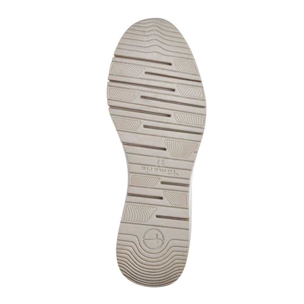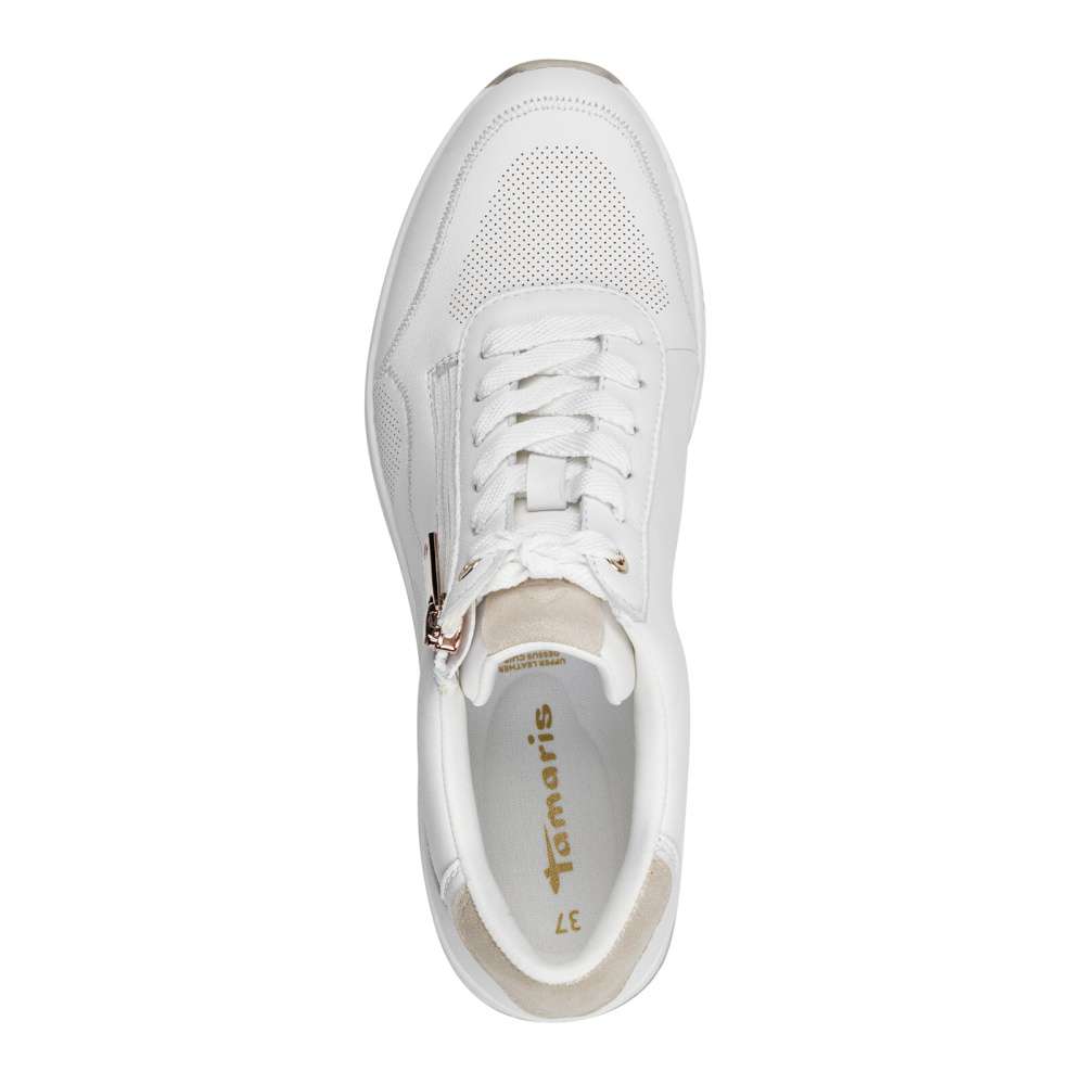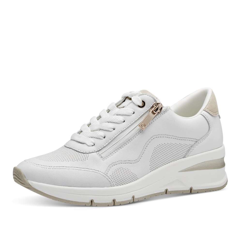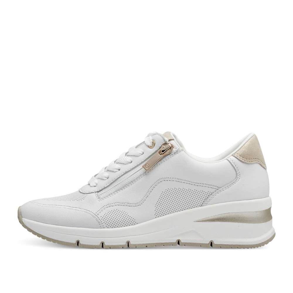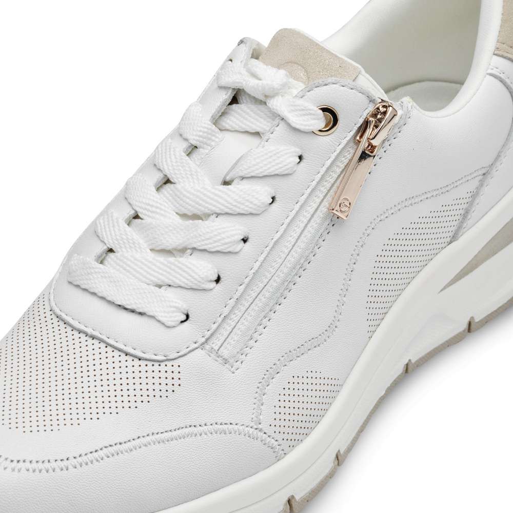 Tyto bílé tenisky značky Tamaris přinášejí moderní design a vysoký komfort pro každou z Vás. Zip umístěný na nártu zajišťuje snadné obouvání a vyzouvání, zatímco šněrování vám umožňuje přizpůsobit si boty podle vašich potřeb. Vyšší podrážka v kombinaci barev dodává teniskám stylový vzhled a měkká vyjímatelná stélka zajišťuje pohodlí pro váš celodenní komfort. Tamaris tenisky jsou vhodné pro ženy, které očekávají od své obuvi nejen styl, ale také pohodlí.