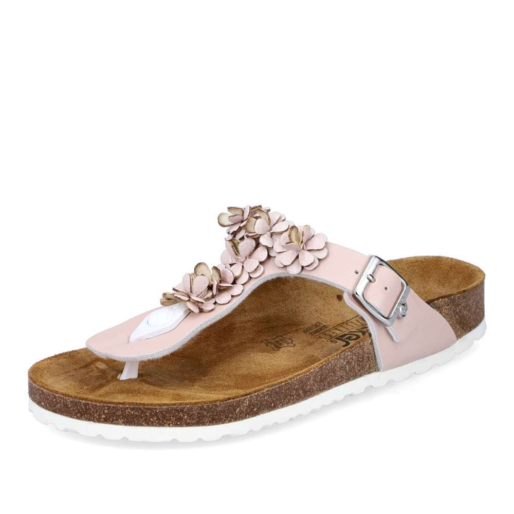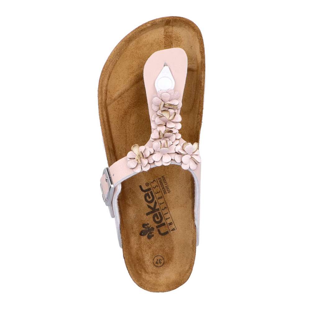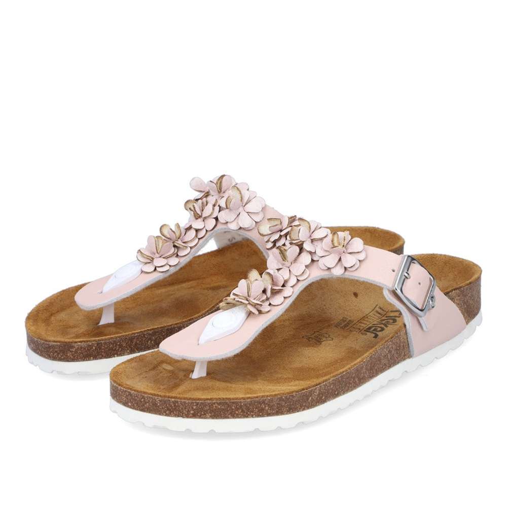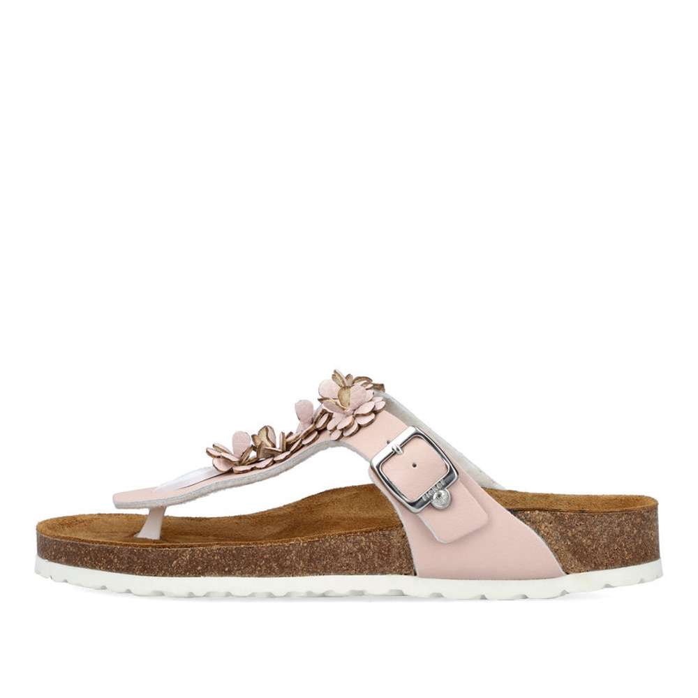 Tento model žabkového stylu značky RIEKER dodá Vašim outfitům romantický vzhled. Kožený svršek růžové barvy je zdobný kytičkovou aplikací a stříbrnou přezkou si můžete obuv nastavit dle svých požadavků. Příjemně měkká kožená stélka je pro maximální pohodlí tvarovaná. Tento model je vhodný na pochůzky městem či na letní dovolenou.