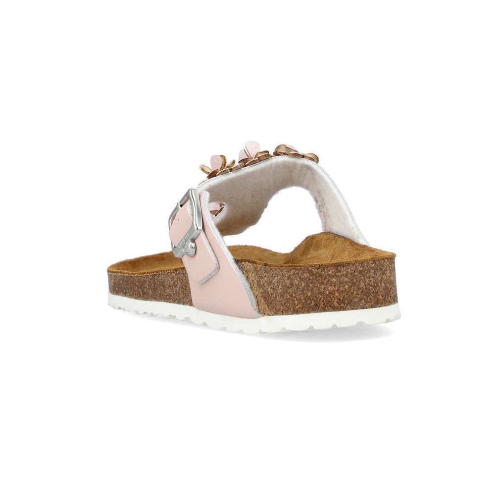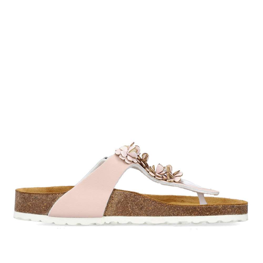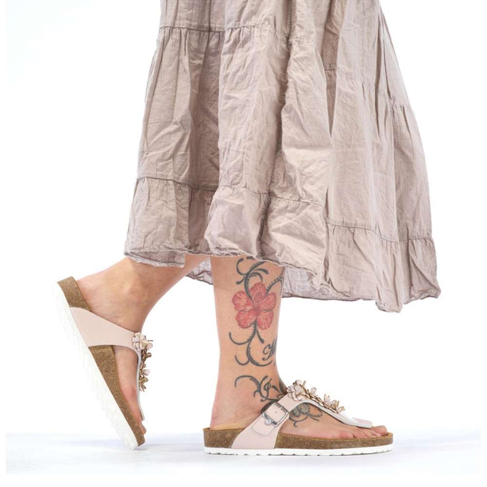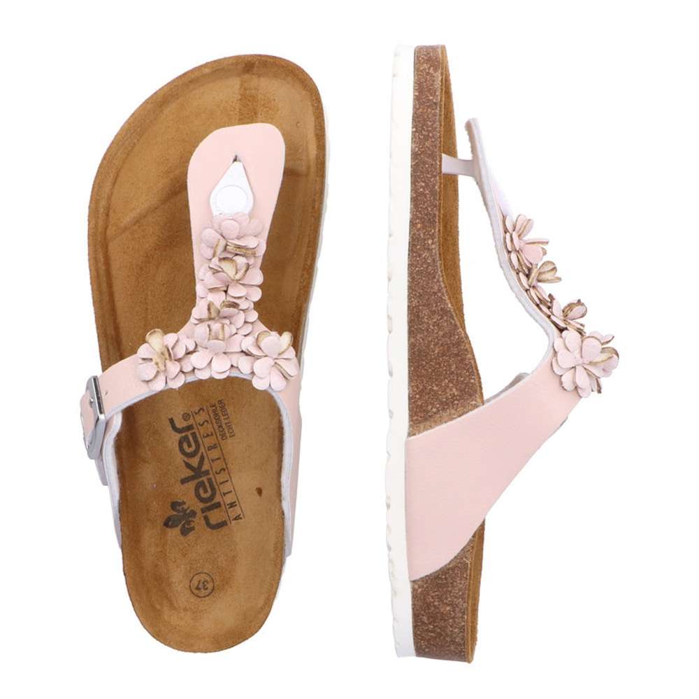 Tento model žabkového stylu značky RIEKER dodá Vašim outfitům romantický vzhled. Kožený svršek růžové barvy je zdobný kytičkovou aplikací a stříbrnou přezkou si můžete obuv nastavit dle svých požadavků. Příjemně měkká kožená stélka je pro maximální pohodlí tvarovaná. Tento model je vhodný na pochůzky městem či na letní dovolenou.