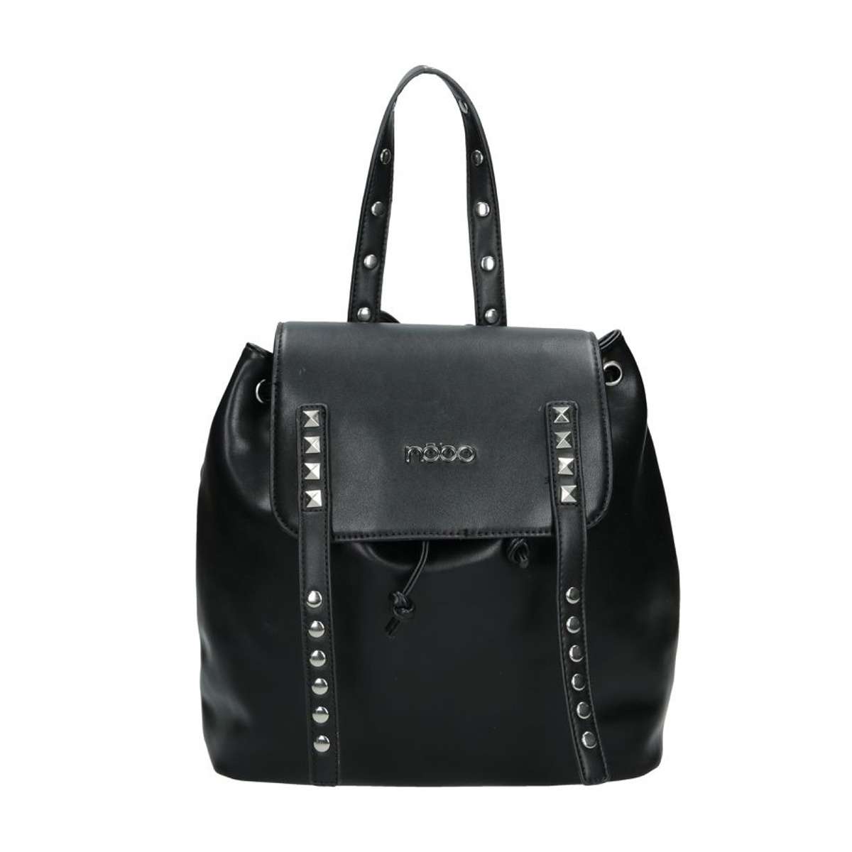Černý batoh od značky Nobo v rockovém stylu s kovovými cvočky a logem značky na přední straně. Uzavíratelný je klopou a šňůrkami na stáhnutí, kdy po otevření uvnitř najdeme menší kapsičky na Vaše drobnosti. Batoh má dva velikostně regulovatelné zadní popruhy a ucho na nošení v ruce. Můžete ho sladit například s koženou bundou a stylovými teniskami z naší široké nabídky.