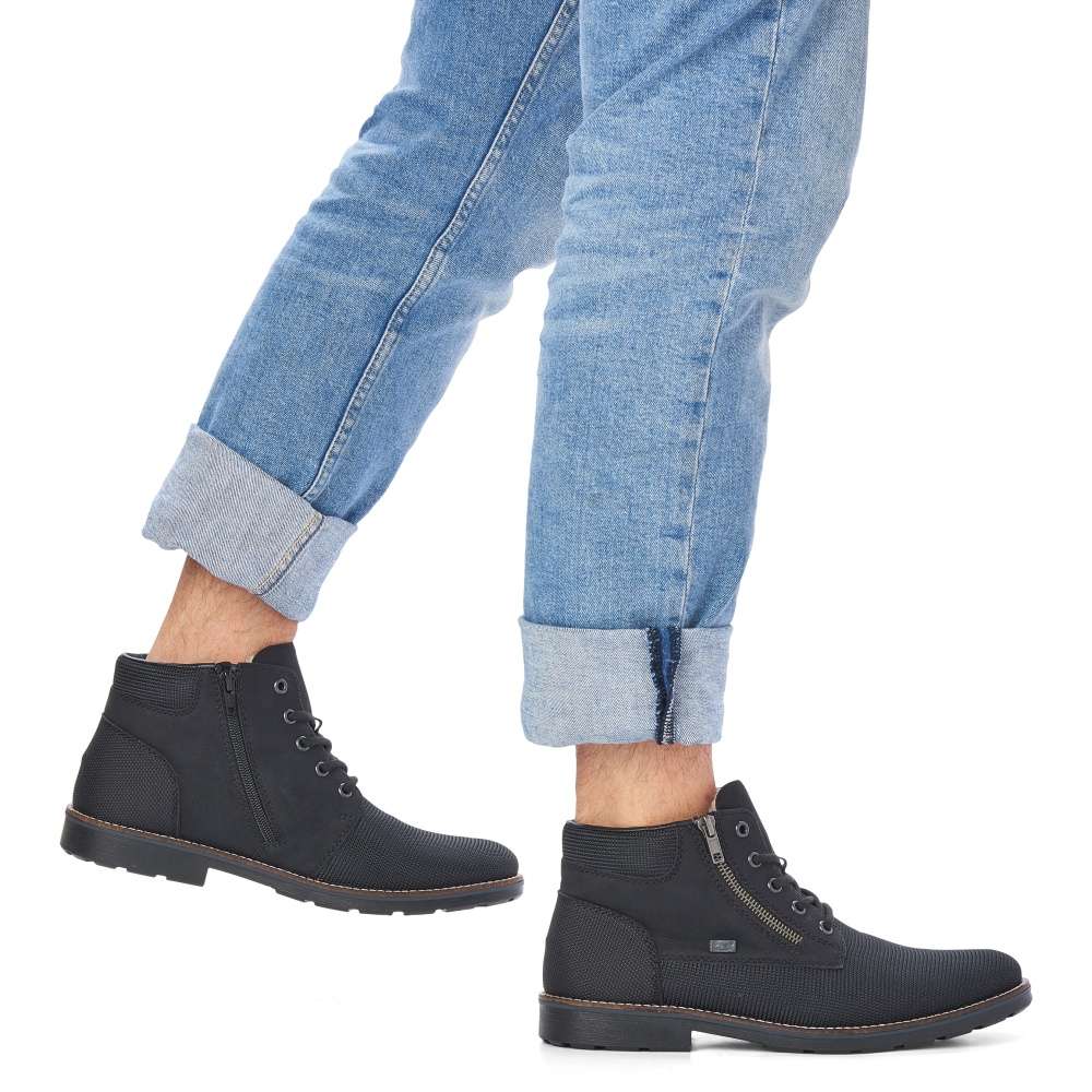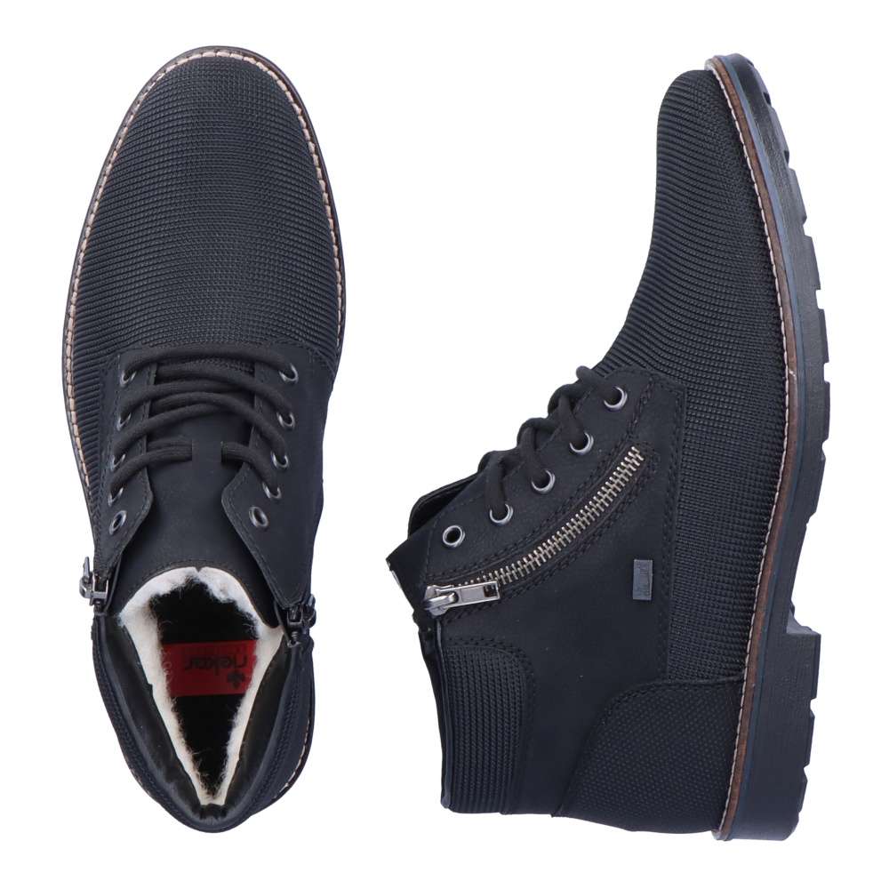 Nápaditá pánská obuv od značky RIEKER s horním lemem a kontrastně prošitou podešví. Boty jsou vybaveny funkčním zipem a tkaničkami na šněrování, díky kterým si je můžete upravit přesně podle Vašich představ. Zateplená jehněčí podšívka a měkká stélka zaručí pohodlí a komfort po celý den nošení. Ideální volba do chladných, zimních dnů.