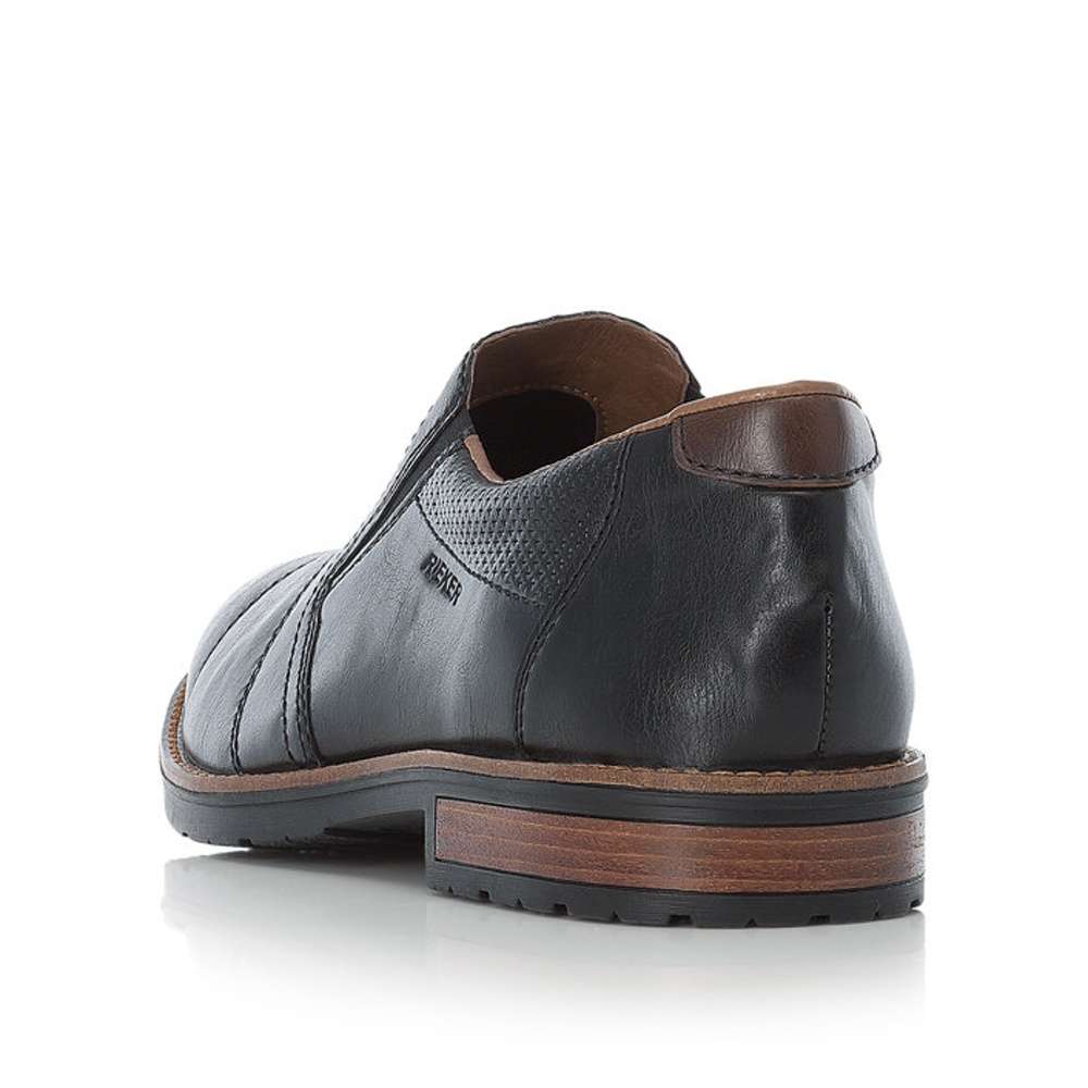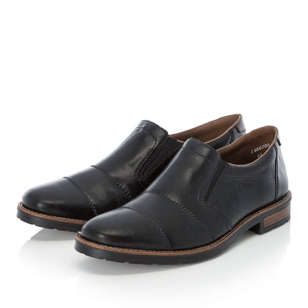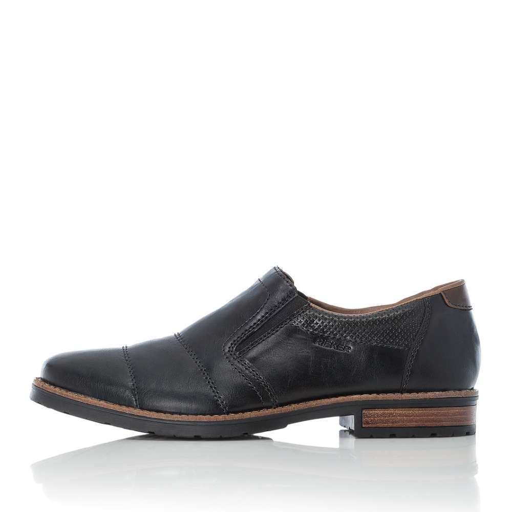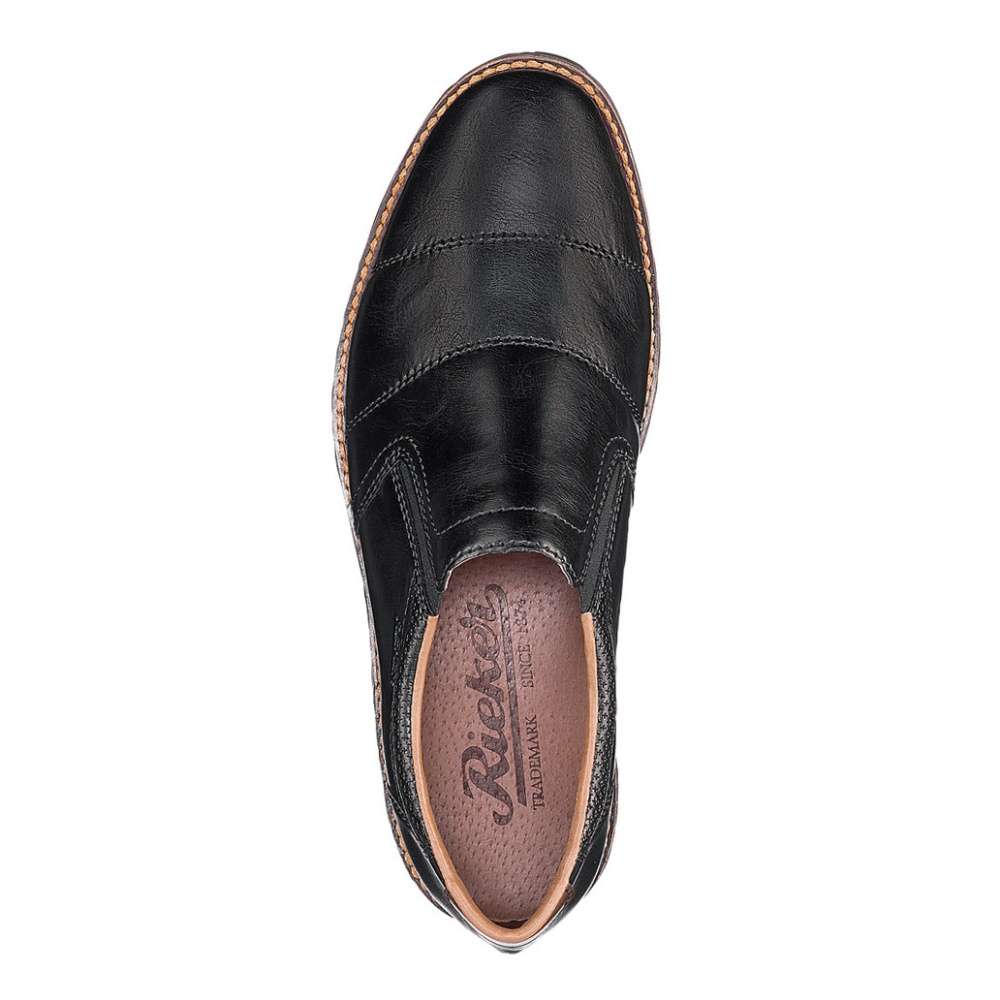 Parádní pánské mokasíny mají jednoduchý styl, který podtrhne jejich elegantnost. Designový díl na straně s nápisem Rieker, moderní šití, lemování po obvodu podešve a proužek v podpatku jsou prvky, které Vás upoutají na první pohled. Po stranách jsou všity pružné gumičky pro snadné obutí. Tento model unosíte ke všem pracovní i osobním příležitostem.