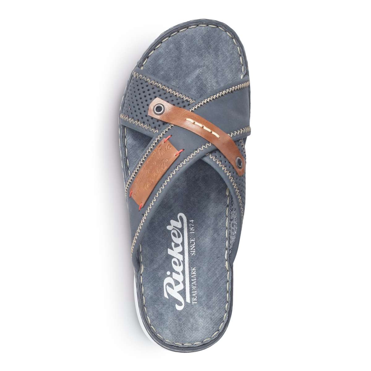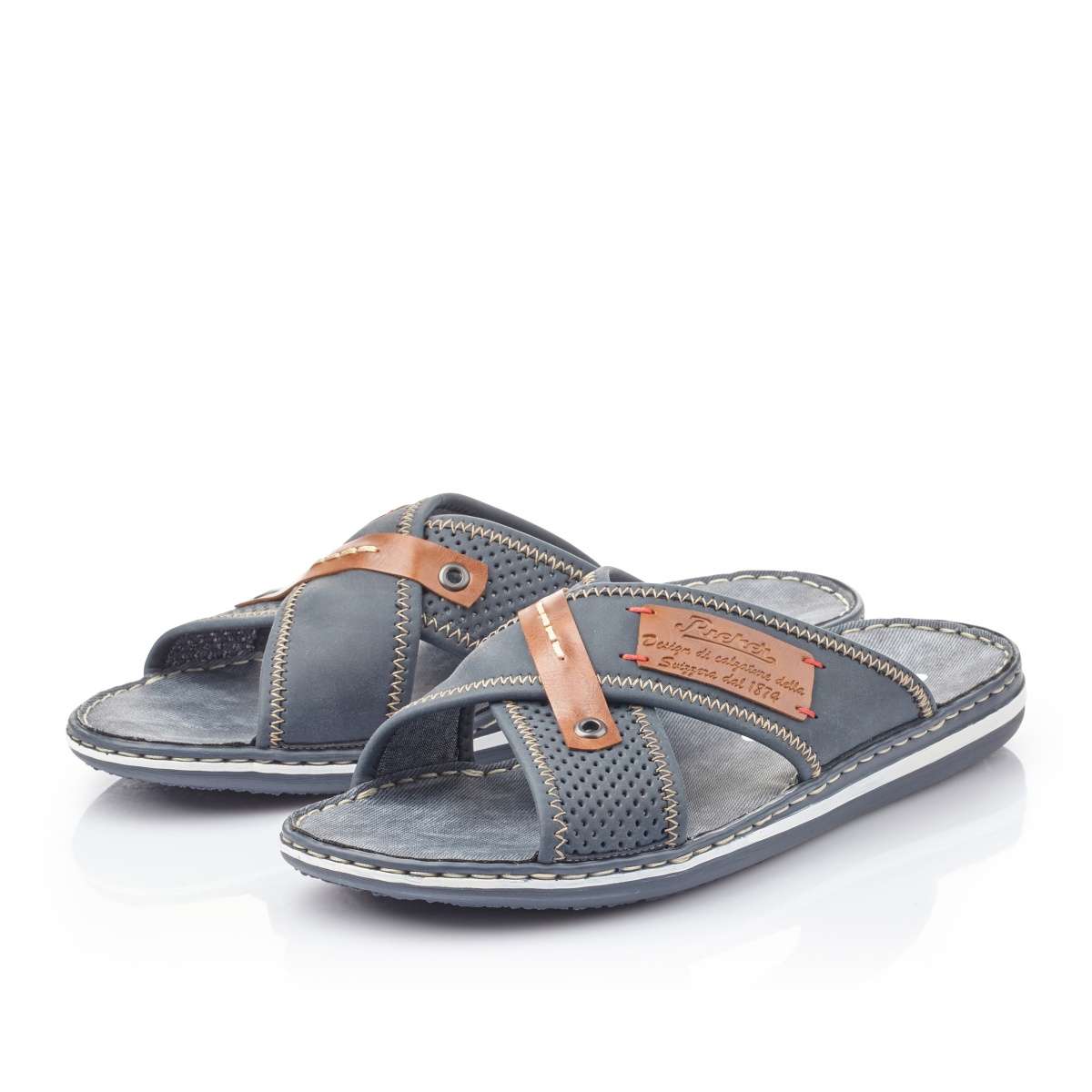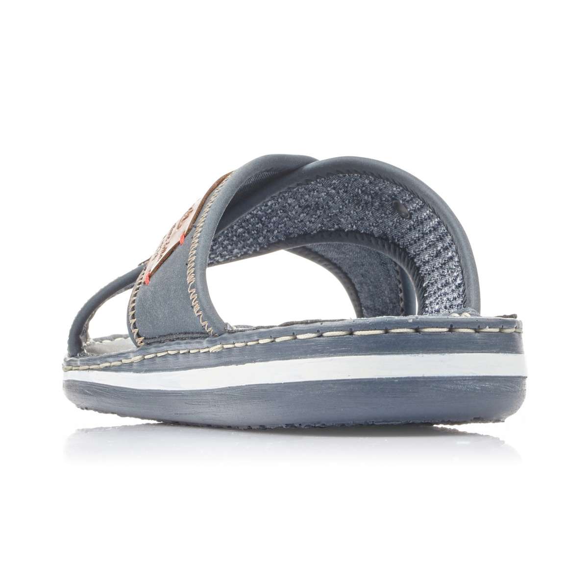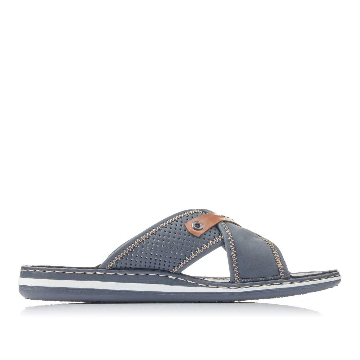 Pánské nazouváky značky Rieker jsou zdobené kontrastním lemováním podešve. Svršek má zajímavý vzhled díky překříženým páskům, kontrastním prvkům a různobarevnému prošívání. Tento velmi pohodlný vzor unosíte ke kraťasům do práce nebo na běžné pochůzky.