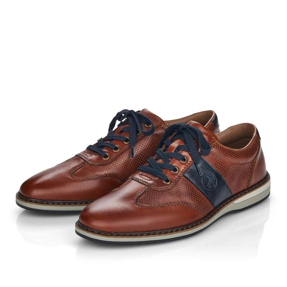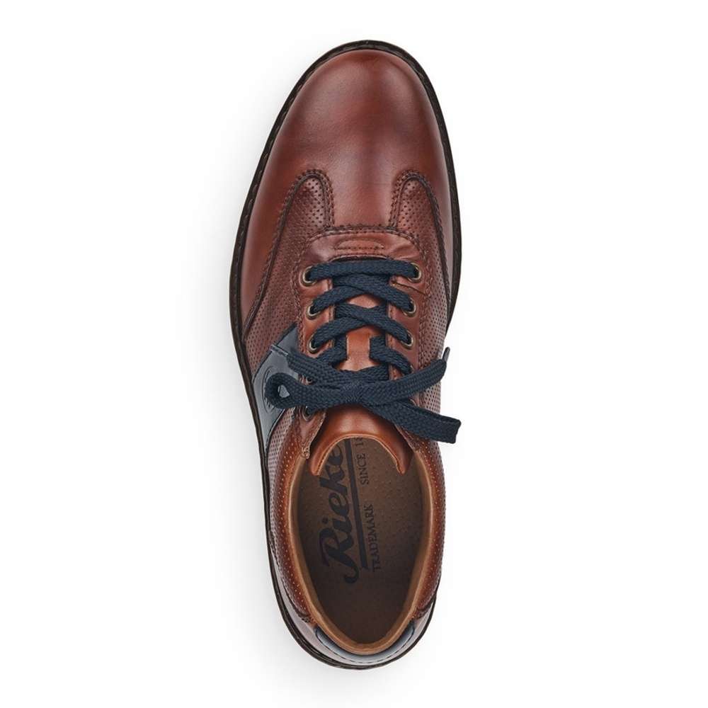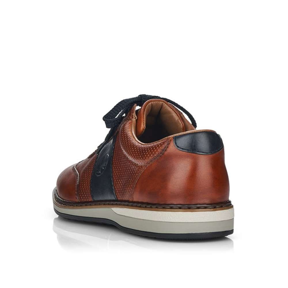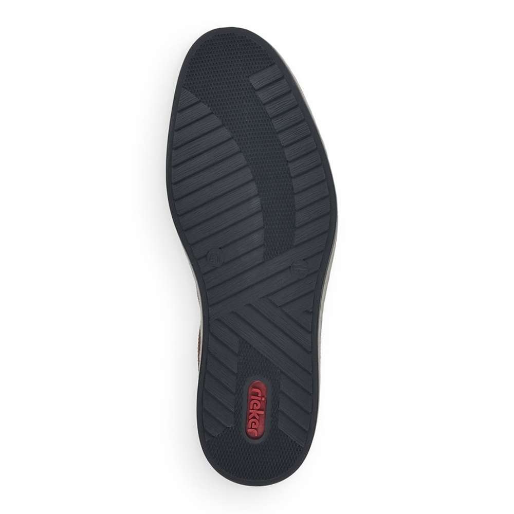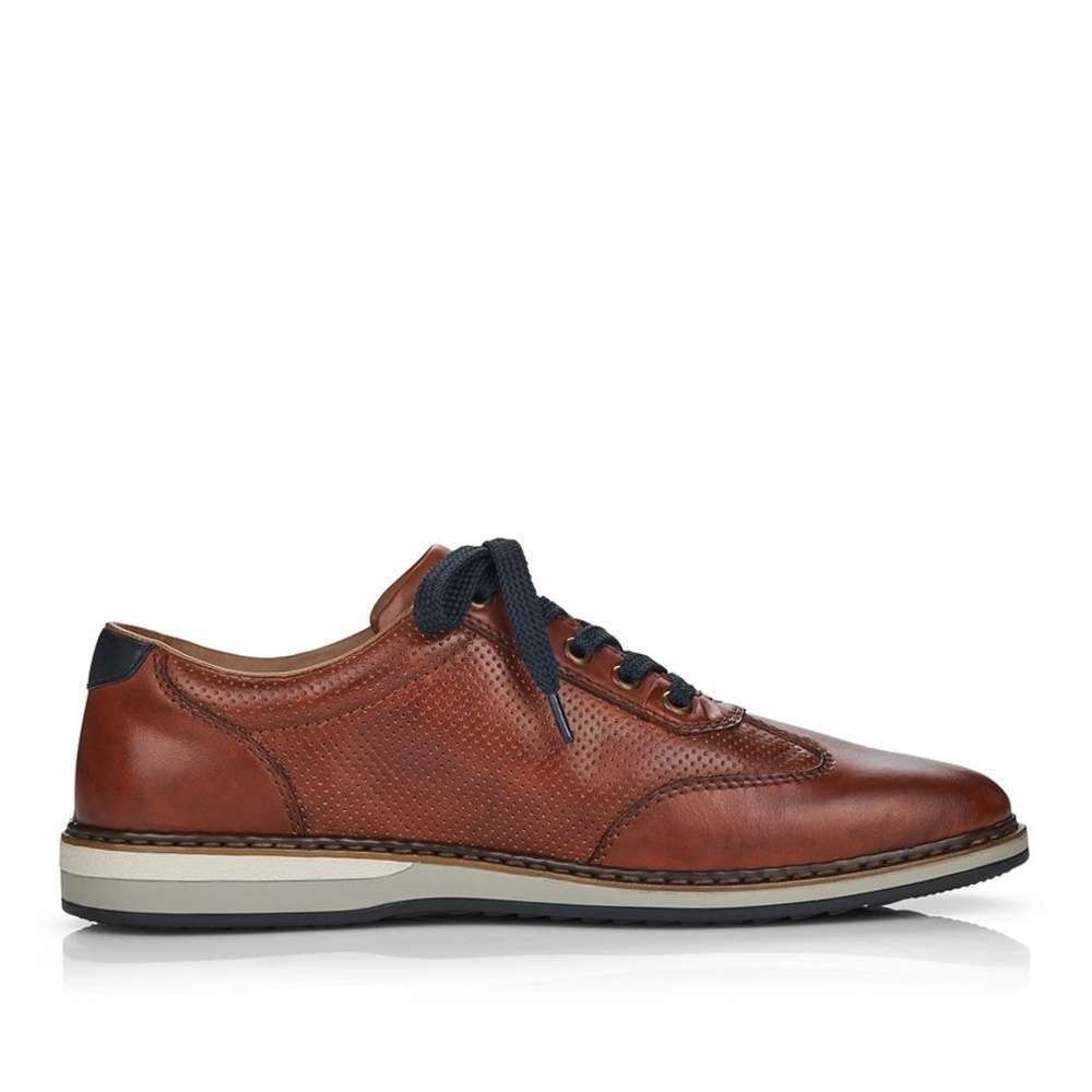 Tento model polobotek značky RIEKER oceníte díky jejich sportovně elegantnímu vzhledu. Hnědý svršek vyrobený z hladké kůže je po stranách povrchově perforován a na vnější straně ozdoben modrým pruhem s vytlačeným logem značky. Snadné nazouvání a přizpůsobení obuvi dle Vašich požadavků zajistí šněrování kontrastními tkaničkami. Stélka je pro Vaše pohodlí vyrobena z paměťové pěny a podešev dolaďuje celkový vzhled k dokonalosti. Tyto polobotky se budou skvěle hodit na pracovní schůzky i na procházky s přáteli.